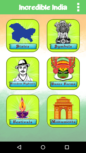 My India App includes 7 categories about India covering "Different States and Capitals", "Symbols", "Freedom Fighters", "Dance forms", "Various Festivals", "Monuments" and "Temples".